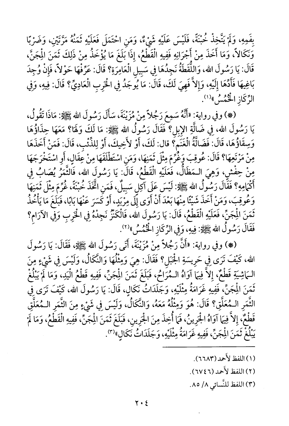 - وفي رواية: «أن رجلا من مزينة، أتى رسول الله صَلى الله عَليه وسَلم فقال: يا رسول الله، كيف ترى في حريسة الجبل؟ فقال: هي ومثلها والنكال، وليس في شيء من الماشية قطع، إلا فيما آواه المراح، فبلغ ثمن المجن، ففيه قطع اليد، وما لم يبلغ ثمن المجن، ففيه غرامة مثليه، وجلدات نكال، قال: يا رسول الله، كيف ترى في الثمر المعلق؟ قال: هو ومثله معه، والنكال، وليس في شيء من الثمر المعلق قطع، إلا فيما آواه الجرين، فما أخذ من الجرين، فبلغ ثمن المجن، ففيه القطع، وما لم يبلغ ثمن المجن، ففيه غرامة مثليه، وجلدات نكال» (¬١).