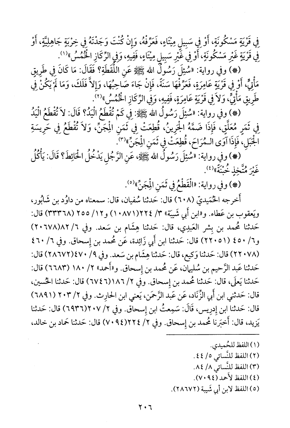 - وفي رواية: «سئل رسول الله صَلى الله عَليه وسَلم: في كم تقطع اليد؟ قال: لا تقطع اليد في ثمر معلق، فإذا ضمه الجرين، قطعت في ثمن المجن، ولا تقطع في حريسة الجبل، فإذا آوى المراح، قطعت في ثمن المجن» (¬١).