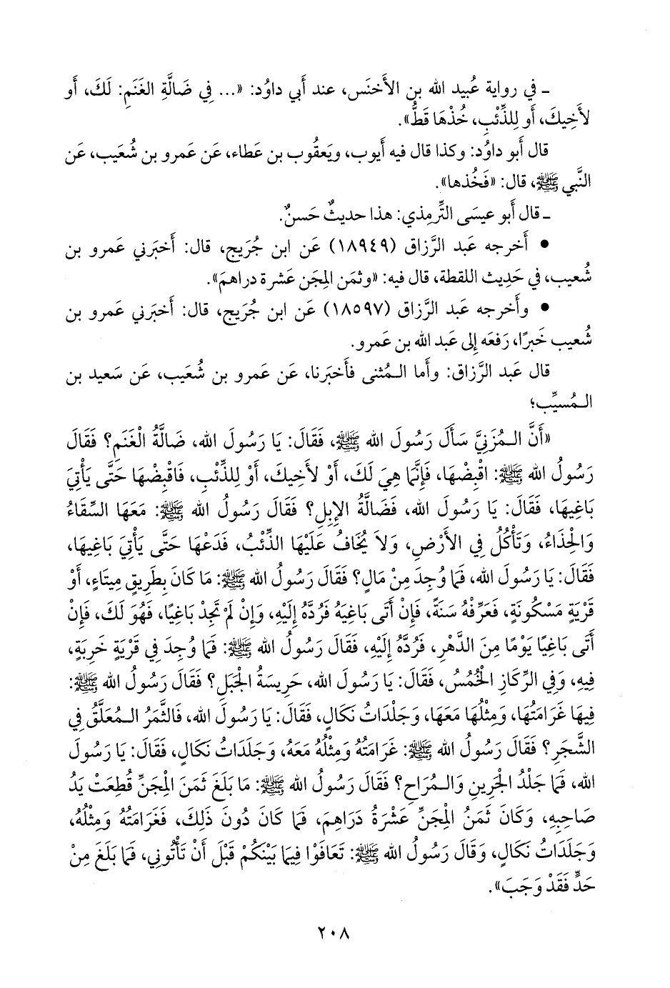 «أن المزني سأل رسول الله صَلى الله عَليه وسَلم فقال: يا رسول الله، ضالة الغنم؟ فقال رسول الله صَلى الله عَليه وسَلم: اقبضها، فإنما هي لك، أو لأخيك، أو للذئب، فاقبضها حتى يأتي باغيها، فقال: يا رسول الله، فضالة الإبل؟ فقال رسول الله صَلى الله عَليه وسَلم: معها السقاء والحذاء، وتأكل في الأرض، ولا يخاف عليها الذئب، فدعها حتى يأتي باغيها، فقال: يا رسول الله، فما وجد من مال؟ فقال رسول الله صَلى الله عَليه وسَلم: ما كان بطريق ميتاء، أو قرية مسكونة، فعرفه سنة، فإن أتى باغيه فرده إليه، وإن لم تجد باغيا، فهو لك، فإن أتى باغيا يوما من الدهر، فرده إليه، فقال رسول الله صَلى الله عَليه وسَلم: فما وجد في قرية خربة، فيه، وفي الركاز الخمس، فقال: يا رسول الله، حريسة الجبل؟ فقال رسول الله صَلى الله عَليه وسَلم: فيها غرامتها، ومثلها معها، وجلدات نكال، فقال: يا رسول الله، فالثمر المعلق في الشجر؟ فقال رسول الله صَلى الله عَليه وسَلم: غرامته ومثله معه، وجلدات نكال، فقال: يا رسول الله، فما جلد الجرين والمراح؟ فقال رسول الله صَلى الله عَليه وسَلم: ما بلغ ثمن المجن قطعت يد صاحبه، وكان ثمن المجن عشرة دراهم، فما كان دون ذلك، فغرامته ومثله، وجلدات نكال، وقال رسول الله صَلى الله عَليه وسَلم: تعافوا فيما بينكم قبل أن تأتوني، فما بلغ من حد فقد وجب».