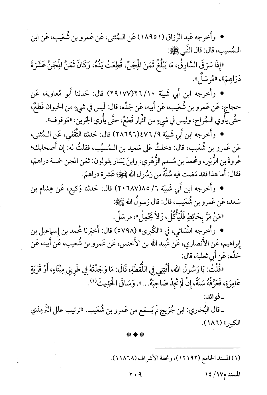 - وأخرجه ابن أبي شيبة (٢٨٦٩٦) قال: حدثنا الثقفي، عن المثنى، عن عَمرو بن شعيب، قال: دخلت على سعيد بن المُسَيب، فقلت له: إن أصحابك؛ عروة بن الزبير، ومحمد بن مسلم الزُّهْري، وابن يسار يقولون: ثمن المجن خمسة دراهم، فقال: أما هذا فقد مضت فيه سنة من رسول الله صَلى الله عَليه وسَلم؛ عشرة دراهم.