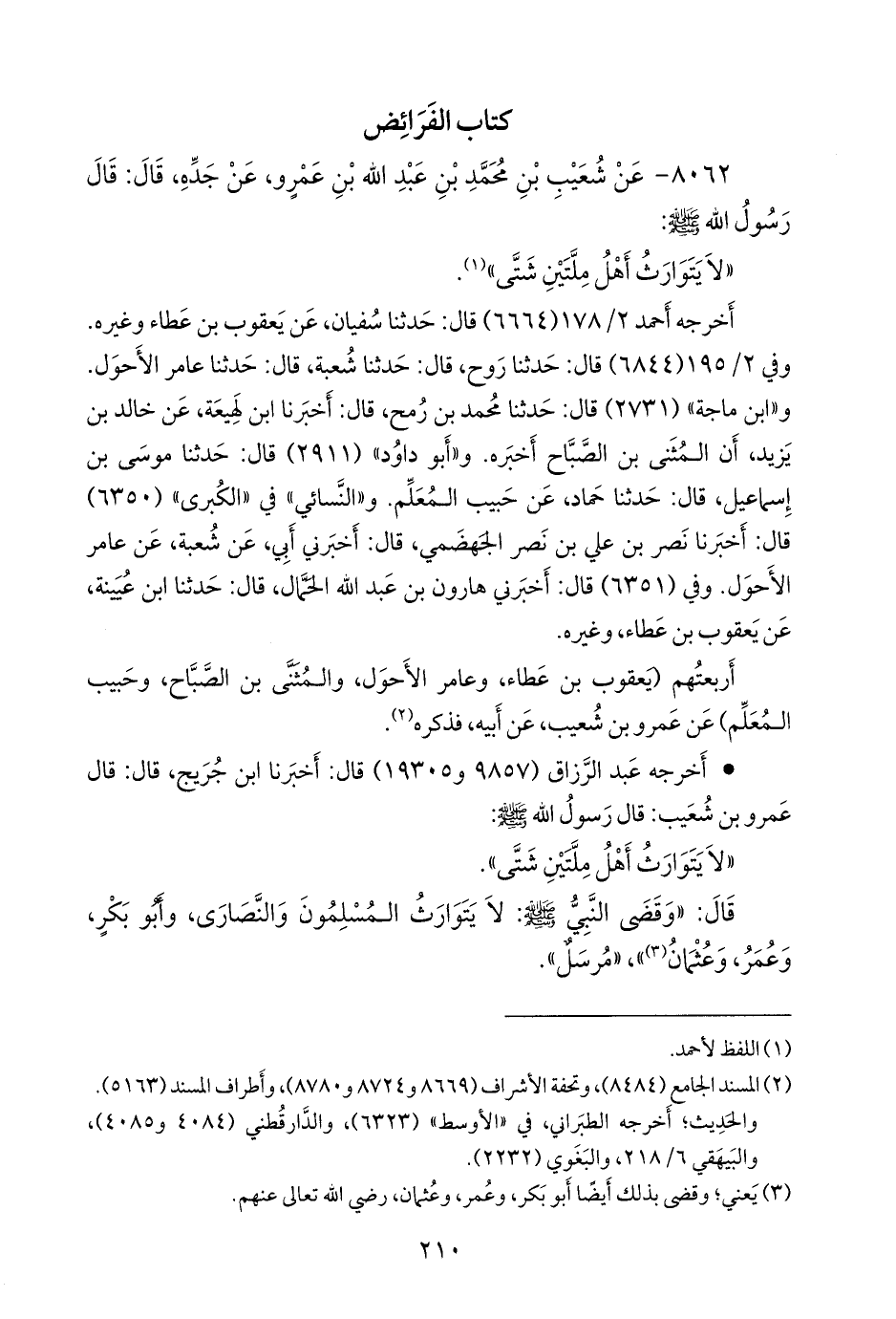 قال: «وقضى النبي صَلى الله عَليه وسَلم: لا يتوارث المسلمون والنصارى وأبو بكر وعمر وعثمان (¬٣)»، «مُرسَل».