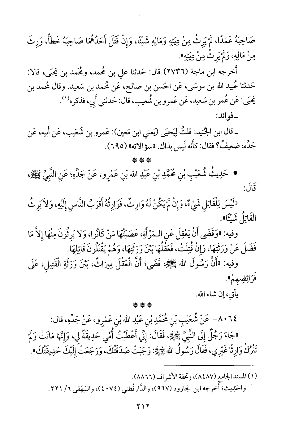 وفيه: وقال رسول الله صَلى الله عَليه وسَلم: ليس للقاتل شيء، وإن لم يكن له وارث، فوارثه أقرب الناس إليه، ولا يرث القاتل شيئا».