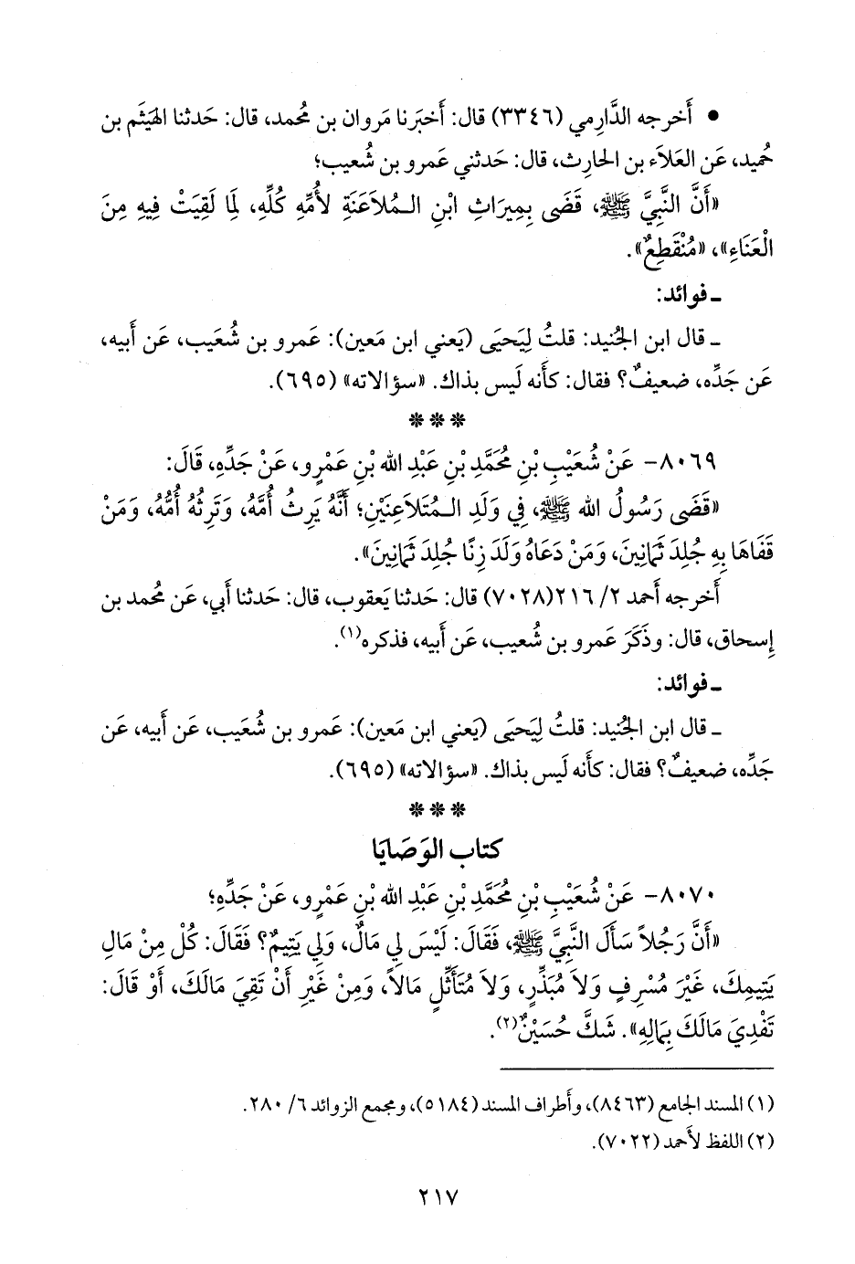 - قلنا: إِسناده ضعيفٌ؛ عَمرو بن شُعَيب بن محمد بن عبد الله بن عَمرو بن العاص ليس بحجة. انظر فوائد الحديث رقم (٧٩١٠).