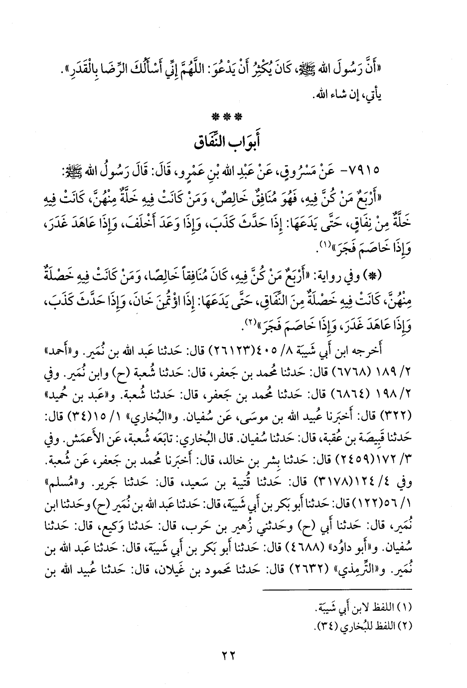 - وفي رواية: «أربع من كن فيه، كان منافقا خالصا، ومن كانت فيه خصلة منهن، كانت فيه خصلة من النفاق، حتى يدعها: إذا اؤتمن خان، وإذا حدث كذب، وإذا عاهد غدر، وإذا خاصم فجر» (¬٢).