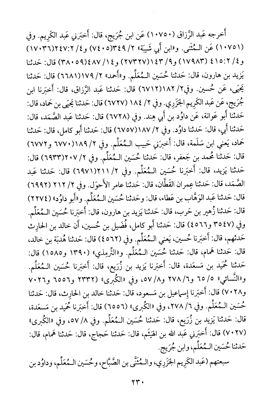 و «أحمد» ٢/ ١٧٩ (٦٦٨١) قال: حدثنا يحيى، عن حسين. وفي ٢/ ١٨٢ (٦٧١٢) قال: حدثنا عبد الرزاق، قال: أخبرنا ابن جُريج، عن عبد الكريم الجزري. وفي ٢/ ١٨٤ (٦٧٢٧) قال: حدثنا يحيى بن حماد، قال: حدثنا أَبو عَوانة، عن داود بن أبي هند. وفي (٦٧٢٨) قال: حدثنا عبد الصمد، قال: حدثنا أبي، قال: حدثنا داود. وفي ٢/ ١٨٧ (٦٧٥٧) قال: حدثنا أَبو كامل، قال: حدثنا حماد، يعني ابن سلمة، قال: أخبرني حبيب المعلم. وفي ٢/ ١٨٩ (٦٧٧٠ و ٦٧٧٢) قال: حدثنا محمد بن جعفر، قال: حدثنا حسين المُعَلِّم. وفي ٢/ ٢٠٧ (٦٩٣٣) قال: حدثنا يزيد، قال: أخبرنا حسين المُعَلِّم. وفي ٢/ ٢١١ (٦٩٧١) قال: حدثنا عبد الصمد، قال: حدثنا عمران القطان، قال: حدثنا عامر الأحول. وفي ٢/ ٢١٢ (٦٩٩٢) قال: حدثنا عبد الوَهَّاب بن عطاء، قال: وحدثنا حسين المُعَلِّم. و «أَبو داود» (٢٢٧٤) قال: حدثنا زهير بن حرب، قال: حدثنا يزيد بن هارون، قال: أخبرنا حسين المُعَلِّم. وفي (٣٥٤٧ و ٤٥٦٦) قال: حدثنا أَبو كامل فُضيل بن حسين، أن خالد بن الحارث حدثهم، قال: أخبرنا حسين، يعني المعلم. وفي (٤٥٦٢) قال: حدثنا هُدبة بن خالد، قال: حدثنا همام، قال: حدثنا حسين المُعَلِّم. و «التِّرمِذي» (١٣٩٠ و ١٥٨٥) قال: حدثنا حميد بن مَسعَدة، قال: أخبرنا يزيد بن زُريع، قال: أخبرنا حسين المُعَلِّم. و «النَّسَائي» ٥/ ٦٥ و ٦/ ٢٧٨ و ٨/ ٢٥٧، وفي «الكبرى» (٢٣٣٢ و ٦٥٥٦ و ٧٠٢٦ و ٧٠٢٨) قال: أخبرنا إسماعيل بن مسعود، قال: حدثنا خالد بن الحارث، قال: حدثنا حسين المُعَلِّم. وفي ٦/ ٢٧٨، وفي «الكبرى» (٦٥٥٦) قال: أخبرنا حميد بن مَسعَدة، قال: حدثنا يزيد بن زُريع، قال: حدثنا حسين المُعَلِّم.