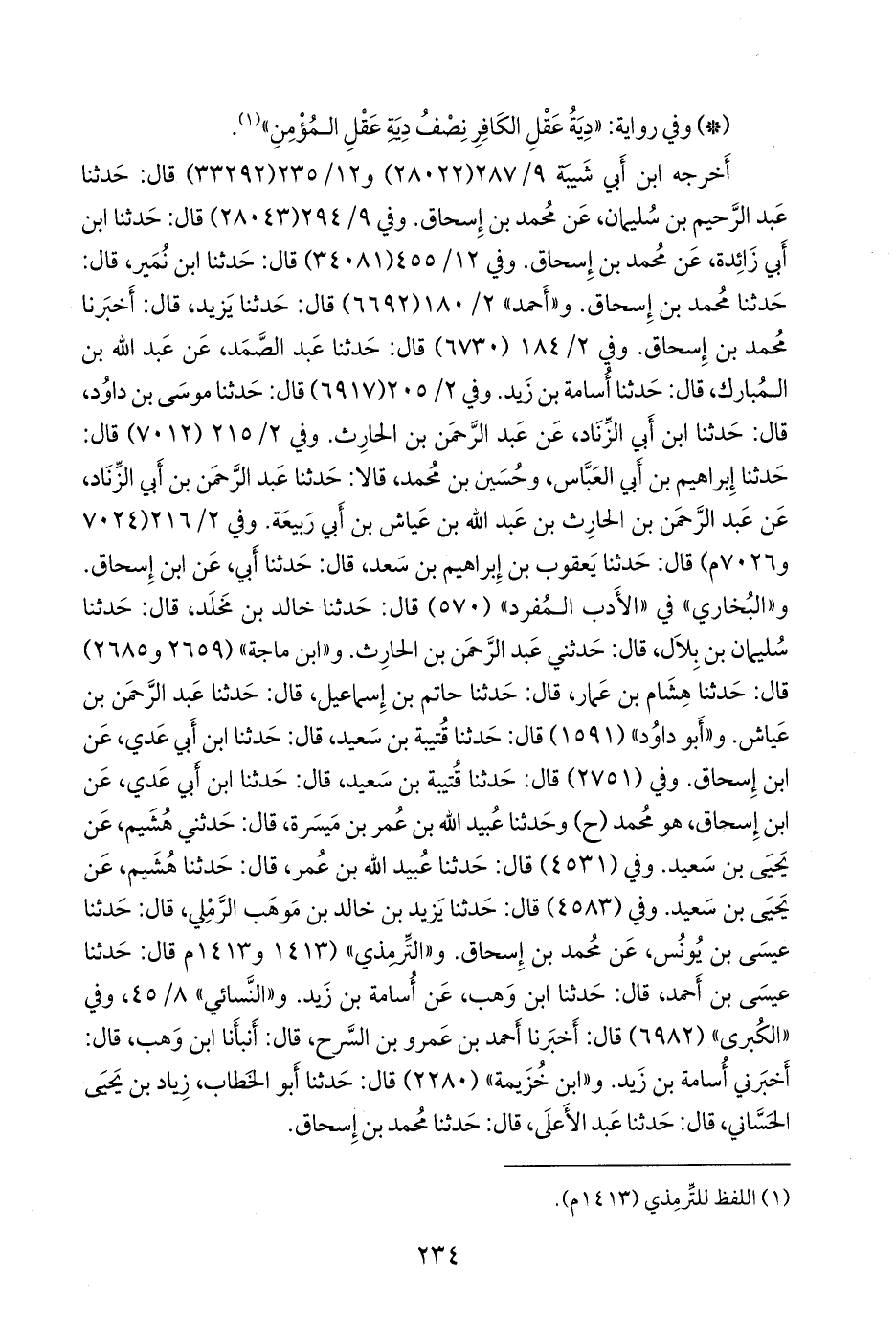 و «ابن ماجة» (٢٦٥٩ و ٢٦٨٥) قال: حدثنا هشام بن عمار، قال: حدثنا حاتم بن إسماعيل، قال: حدثنا عبد الرَّحمَن بن عياش. و «أَبو داود» (١٥٩١) قال: حدثنا قتيبة بن سعيد، قال: حدثنا ابن أَبي عَدي، عن ابن إسحاق. وفي (٢٧٥١) قال: حدثنا قتيبة بن سعيد، قال: حدثنا ابن أَبي عَدي، عن ابن إسحاق، هو محمد (ح) وحدثنا عُبيد الله بن عمر بن ميسرة، قال: حدثني هُشيم، عن يحيى بن سعيد. وفي (٤٥٣١) قال: حدثنا عُبيد الله بن عمر، قال: حدثنا هُشيم، عن يحيى بن سعيد. وفي (٤٥٨٣) قال: حدثنا يزيد بن خالد بن مَوهَب الرملي، قال: حدثنا عيسى بن يونس، عن محمد بن إسحاق. و «التِّرمِذي» (١٤١٣) قال: حدثنا عيسى بن أحمد، قال: حدثنا ابن وهب، عن أُسامة بن زيد. و «النَّسَائي» ٨/ ٤٥، وفي «الكبرى» (٦٩٨٢) قال: أخبرنا أحمد بن عَمرو بن السَّرح، قال: أنبأنا ابن وهب، قال: أخبرني أُسامة بن زيد. و «ابن خزيمة» (٢٢٨٠) قال: حدثنا أَبو الخطاب زياد بن يحيى الحَسَّاني، حدثنا عبد الأعلى، حدثنا محمد بن إسحاق.