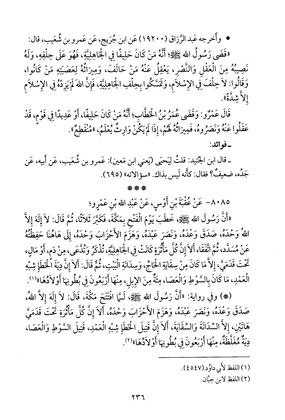 - قلنا: إِسناده ضعيفٌ؛ عَمرو بن شُعَيب بن محمد بن عبد الله بن عَمرو بن العاص ليس بحجة. انظر فوائد الحديث رقم (٧٩١٠).