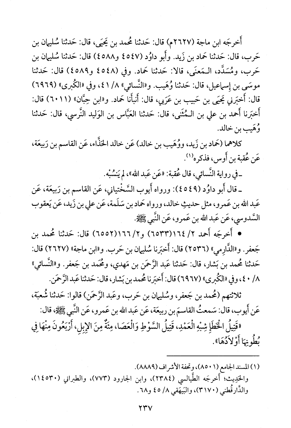 «قتيل الخطإ شبه العمد، قتيل السوط والعصا، مئة من الإبل، أربعون منها في بطونها أولادها».