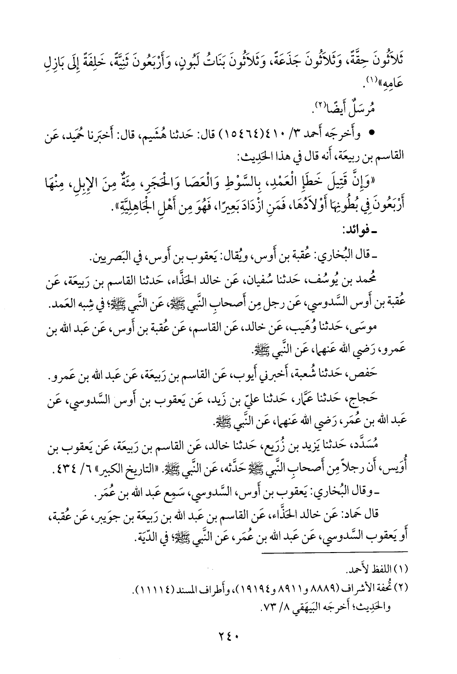 قال حماد: عن خالد الحَذَّاء، عن القاسم بن عبد الله بن ربيعة بن جويبر، عن عقبة، أو يعقوب السدوسي، عن عبد الله بن عمر، عن النبي صَلى الله عَليه وسَلم؛ في الدية.