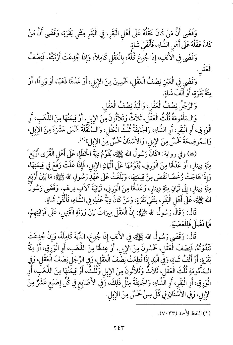 «كان رسول الله صَلى الله عَليه وسَلم يقوم دية الخطإ، على أهل القرى أربع مئة دينار، أو عدلها من الورق، يقومها على أثمان الإبل، فإذا غلت رفع في قيمتها، وإذا هاجت رخصا نقص من قيمتها، وبلغت على عهد رسول الله صَلى الله عَليه وسَلم ما بين أربع مئة دينار، إلى ثمان مئة دينار، وعدلها من الورق، ثمانية آلاف درهم، وقضى رسول الله صَلى الله عَليه وسَلم على أهل البقر، مئتي بقرة، ومن كان دية عقله في الشاء، فألفي شاة.