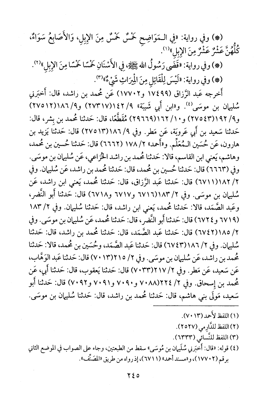 جميعهم (عبد الرزاق بن همام، وحسين بن محمد، وأَبو النضر هاشم بن القاسم، وعبد الصمد بن عبد الوارث، وأَبو سعيد مولى بني هاشم عبد الرَّحمَن ابن عبد الله بن عبيد، وخالد بن يزيد والد محمود، ويزيد بن هارون، ومسلم بن إبراهيم، وزيد بن أبي الزرقاء، وشيبان بن فَرُّوخ، ومحمد بن بَكار، وخليل، وحَبَّان بن هلال، وعبد الرَّحمَن بن مهدي) عن محمد بن راشد، عن سليمان بن موسى (¬١)، عن عَمرو بن شعيب، عن أبيه، فذكره (¬٢).