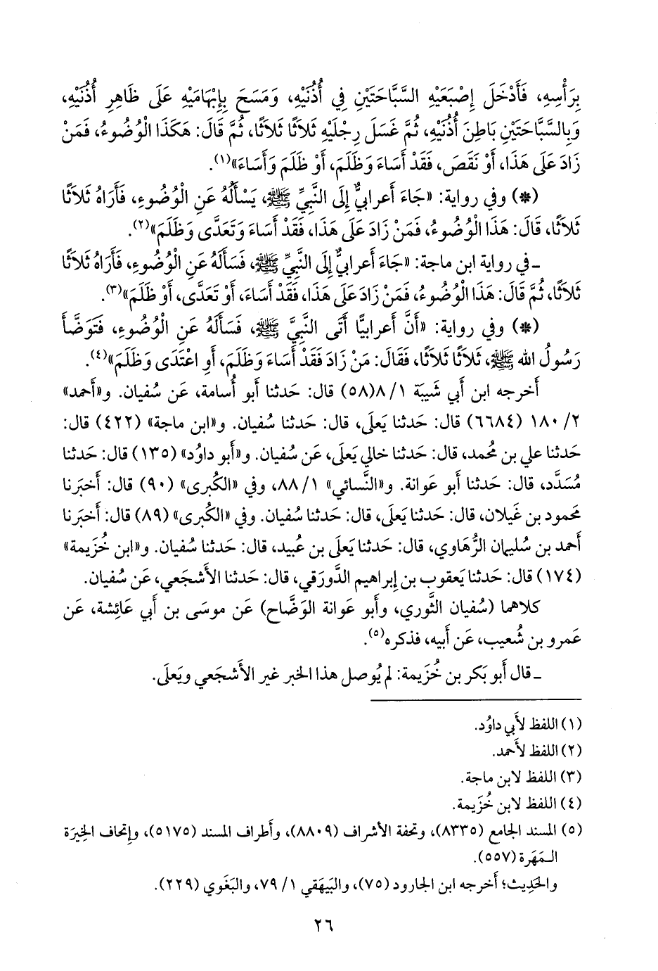 - وفي رواية: «أن أعرابيا أتى النبي صَلى الله عَليه وسَلم فسأله عن الوضوء، فتوضأ رسول الله صَلى الله عَليه وسَلم ثلاثا ثلاثا، فقال: من زاد فقد أساء وظلم، أو اعتدى وظلم» (¬١).
