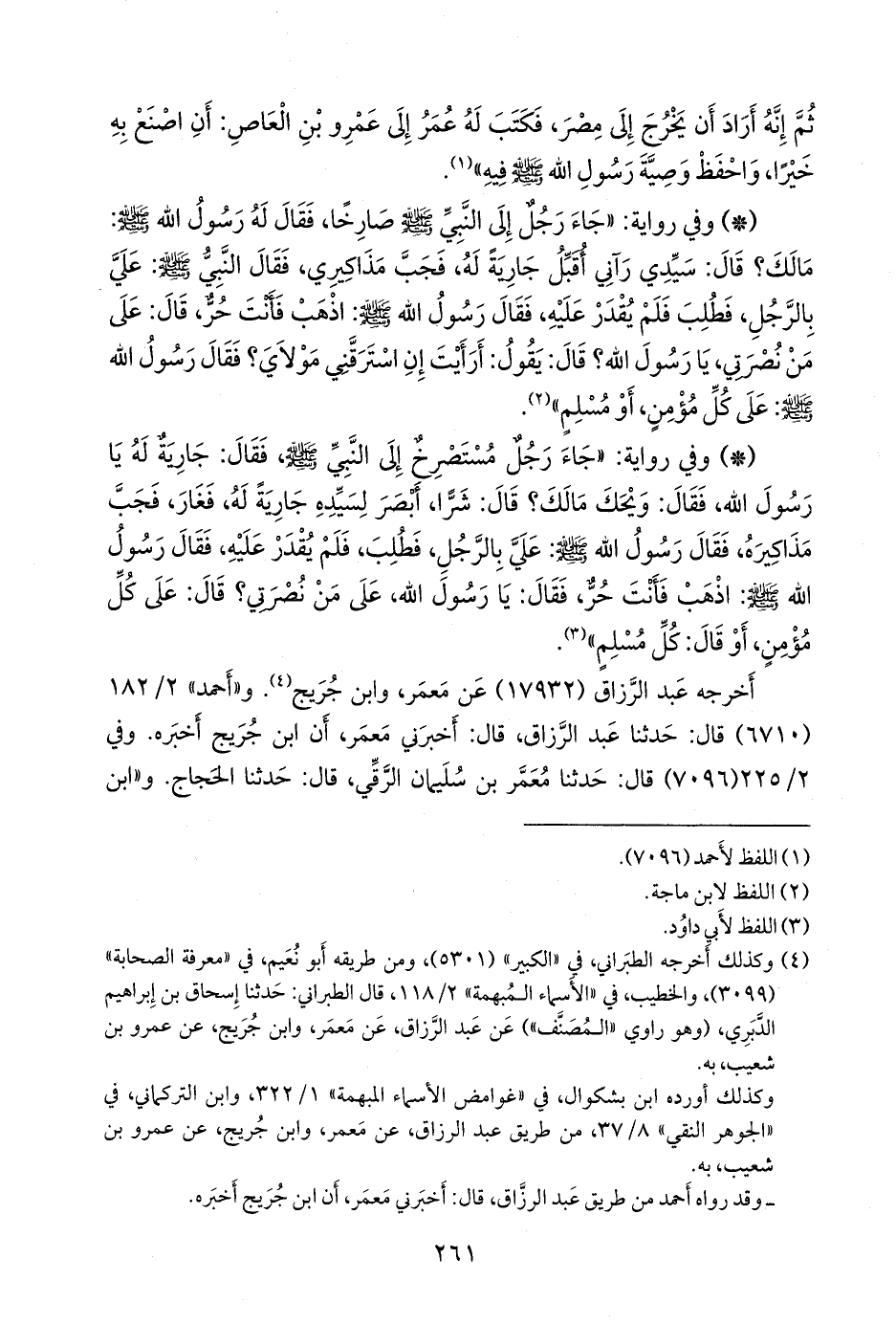 - وفي رواية: «جاء رجل إلى النبي صَلى الله عَليه وسَلم صارخا، فقال له رسول الله صَلى الله عَليه وسَلم: ما لك؟ قال: سيدي رآني أقبل جارية له، فجب مذاكيري، فقال النبي صَلى الله عَليه وسَلم: علي بالرجل، فطلب فلم يقدر عليه، فقال رسول الله صَلى الله عَليه وسَلم: اذهب فأنت حر، قال: على من نصرتي، يا رسول الله؟ قال: يقول: أرأيت إن استرقني مولاي؟ فقال رسول الله صَلى الله عَليه وسَلم: على كل مؤمن، أو مسلم» (¬١).