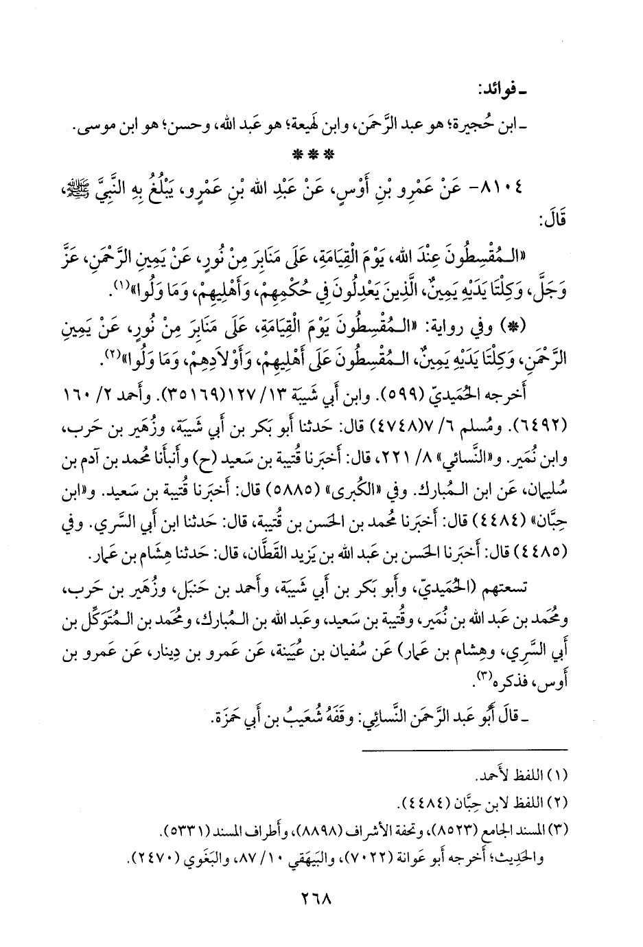 تسعتهم (الحميدي، وأَبو بكر بن أبي شيبة، وأحمد بن حنبل، وزهير بن حرب، ومحمد بن عبد الله بن نُمير، وقتيبة بن سعيد، وعبد الله بن المبارك، ومحمد بن المتوكل بن أبي السري، وهشام بن عمار) عن سفيان بن عُيينة، عن عَمرو بن دينار، عن عَمرو بن أوس، فذكره (¬٤).