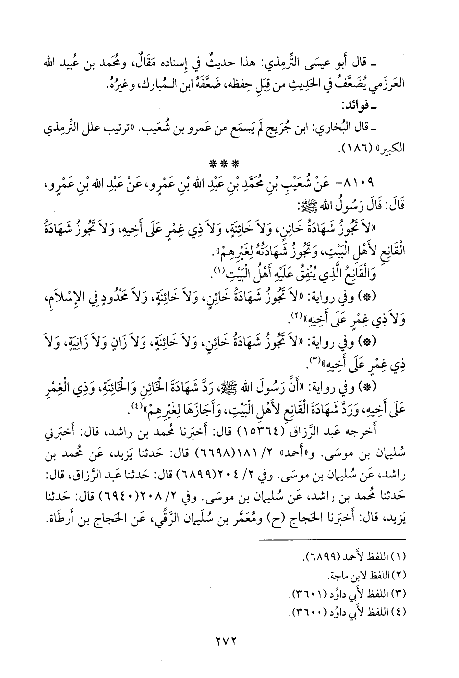 - وفي رواية: «أن رسول الله صَلى الله عَليه وسَلم رد شهادة الخائن والخائنة، وذي الغمر على أخيه، ورد شهادة القانع لأهل البيت، وأجازها لغيرهم» (¬٤).