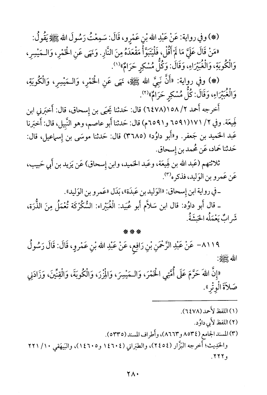 - وقال ابن حَجَر في «النُّكت الظِّراف»: هكذا قال حماد بن سلمة، يعني قال: «الوليد بن عَبَدة»، وخالفه إبراهيم بن سعد، فقال: عن ابن إسحاق، عن يزيد بن أبي حبيب، عن عَمرو بن الوليد، حدثه عن عبد الله بن عَمرو.