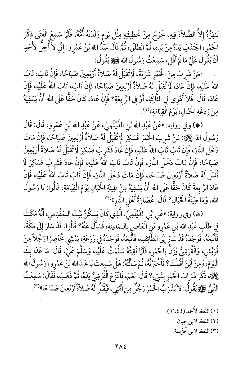 - وفي رواية: «عن ابن الديلمي، الذي كان يسكن بيت المقدس، أنه مكث في طلب عبد الله بن عَمرو بن العاص بالمدينة، فسأل عنه؟ قالوا: قد سار إلى مكة، فأتبعه، فوجده قد سار إلى الطائف، فأتبعه، فوجده في زرعة، يمشي مخاصرا رجلا من قريش، والقرشي يزن بالخمر، فلما لقيته سلمت عليه، وسلم علي، قال: ما عدا بك اليوم، ومن أين أقبلت؟ فأخبرته، ثم سألته: هل سمعتَ يا عبد الله بن عَمرو، رسول الله صَلى الله عَليه وسَلم ذكر شراب الخمر بشيء؟ قال: نعم، فانتزع القرشي يده، ثم ذهب، فقال: سمعت النبي صَلى الله عَليه وسَلم يقول: لا يشرب الخمر رجل من أمتي، فيقبل له صلاة أربعين صباحا» (¬١).