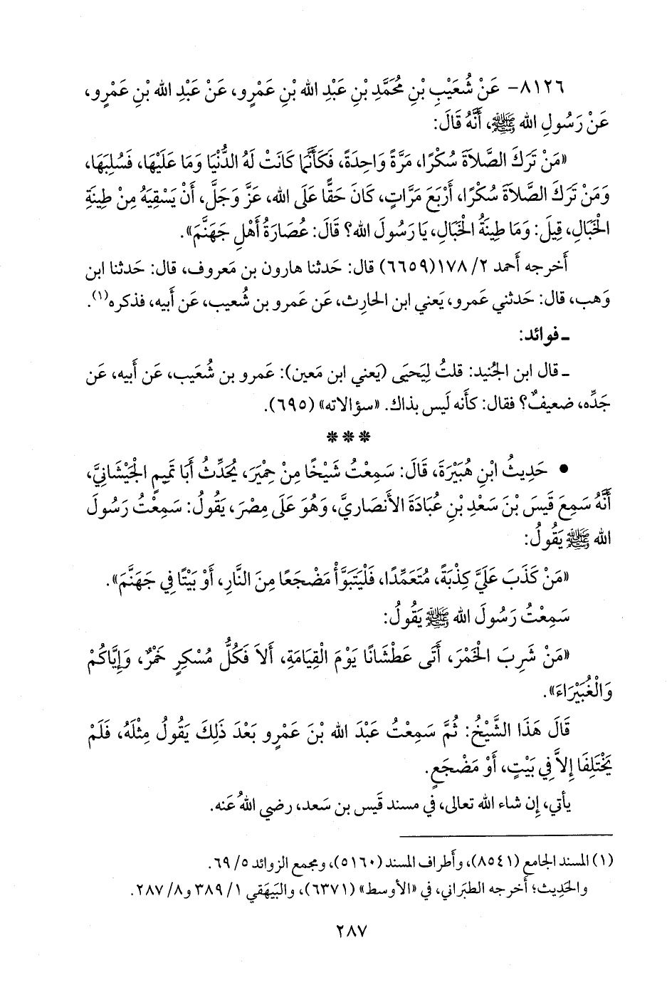 ٨١٢٦ - عن شعيب بن محمد بن عبد الله بن عَمرو، عن عبد الله بن عَمرو، عن رسول الله صَلى الله عَليه وسَلم أنه قال: