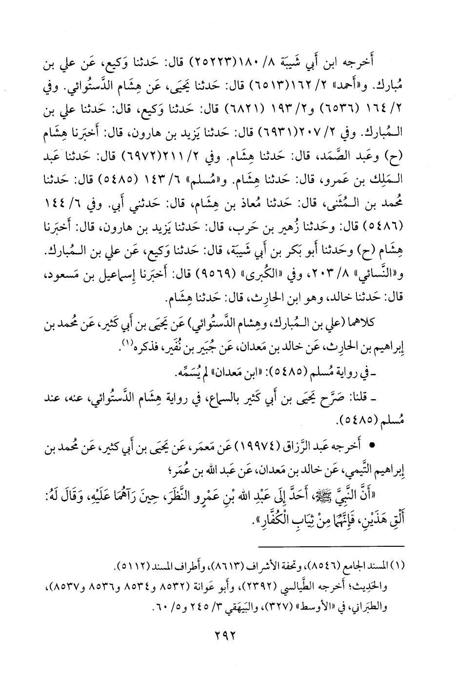 - ولكن الذي في «مسند أبي عَوانة» (٨٩٨٥): من طريق علي بن المبارك، عن يحيى، عن محمد بن إبراهيم، عن خالد بن مَعدان، عن جُبير بن نُفير، عن عبد الله بن عَمرو، به.