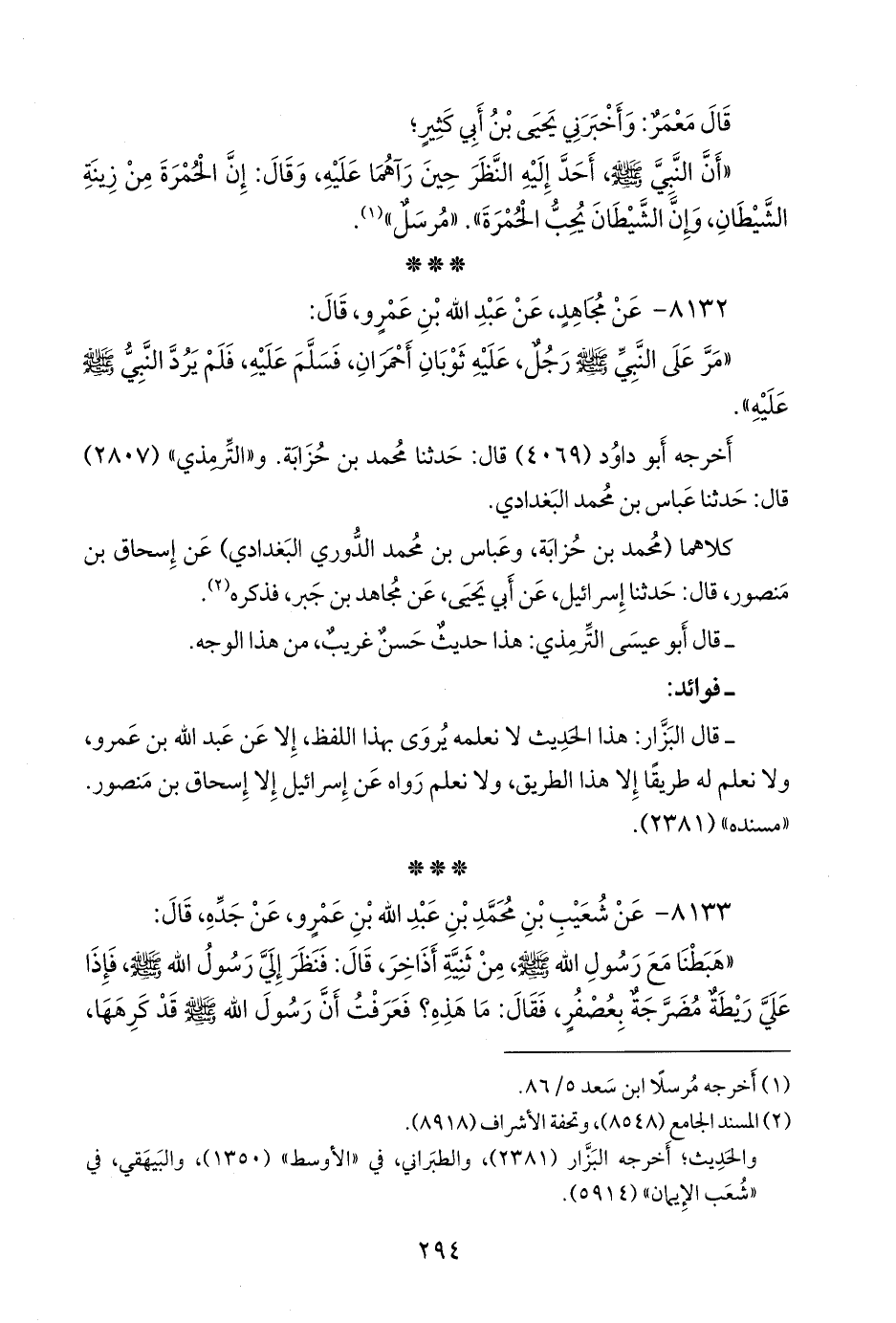 «مر على النبي صَلى الله عَليه وسَلم رجل، عليه ثوبان أحمران، فسلم عليه، فلم يرد النبي صَلى الله عَليه وسَلم عليه».