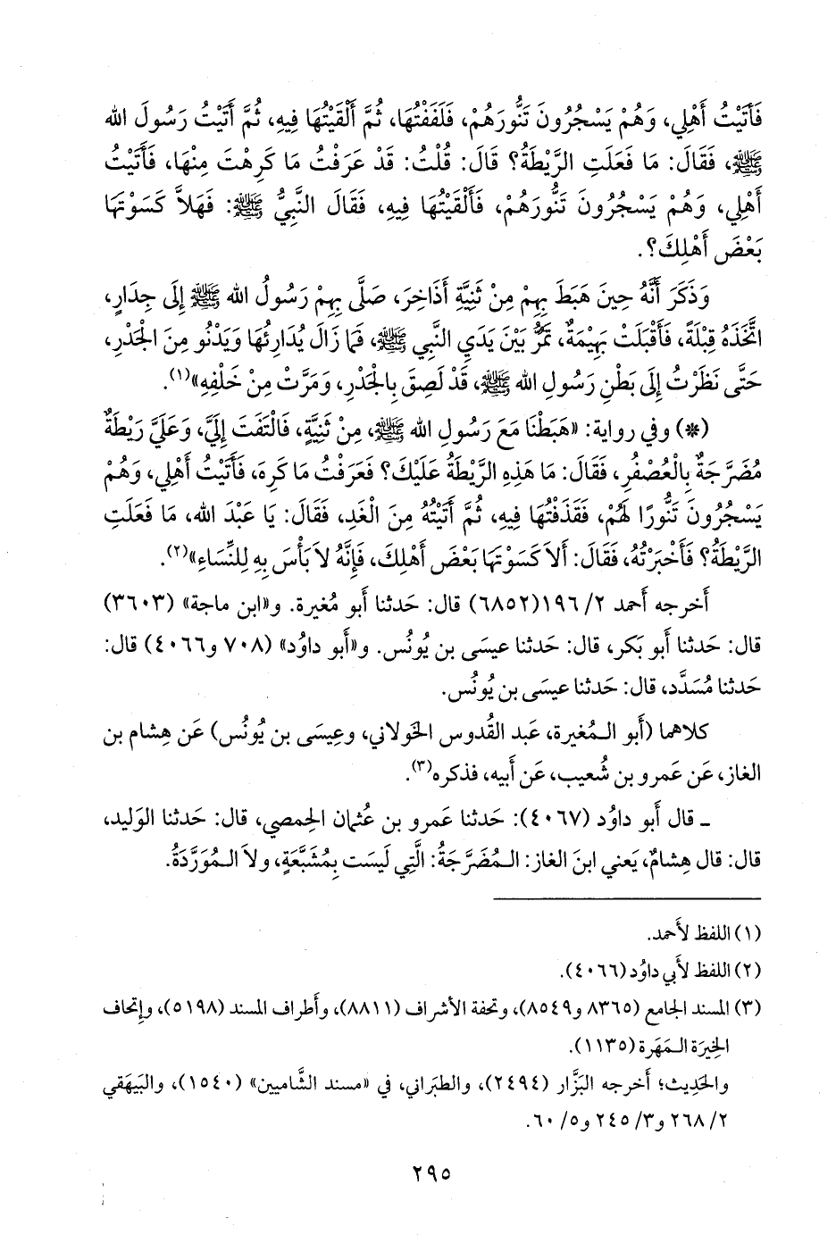 - وفي رواية: «هبطنا مع رسول الله صَلى الله عَليه وسَلم من ثنية، فالتفت إلي، وعلي ريطة مضرجة بالعصفر، فقال: ما هذه الريطة عليك؟ فعرفت ما كره، فأتيت أهلي، وهم يسجرون تنورا لهم، فقذفتها فيه، ثم أتيته من الغد، فقال: يا عبد الله، ما فعلت الريطة؟ فأخبرته، فقال: ألا كسوتها بعض أهلك، فإنه لا بأس به للنساء» (¬١).