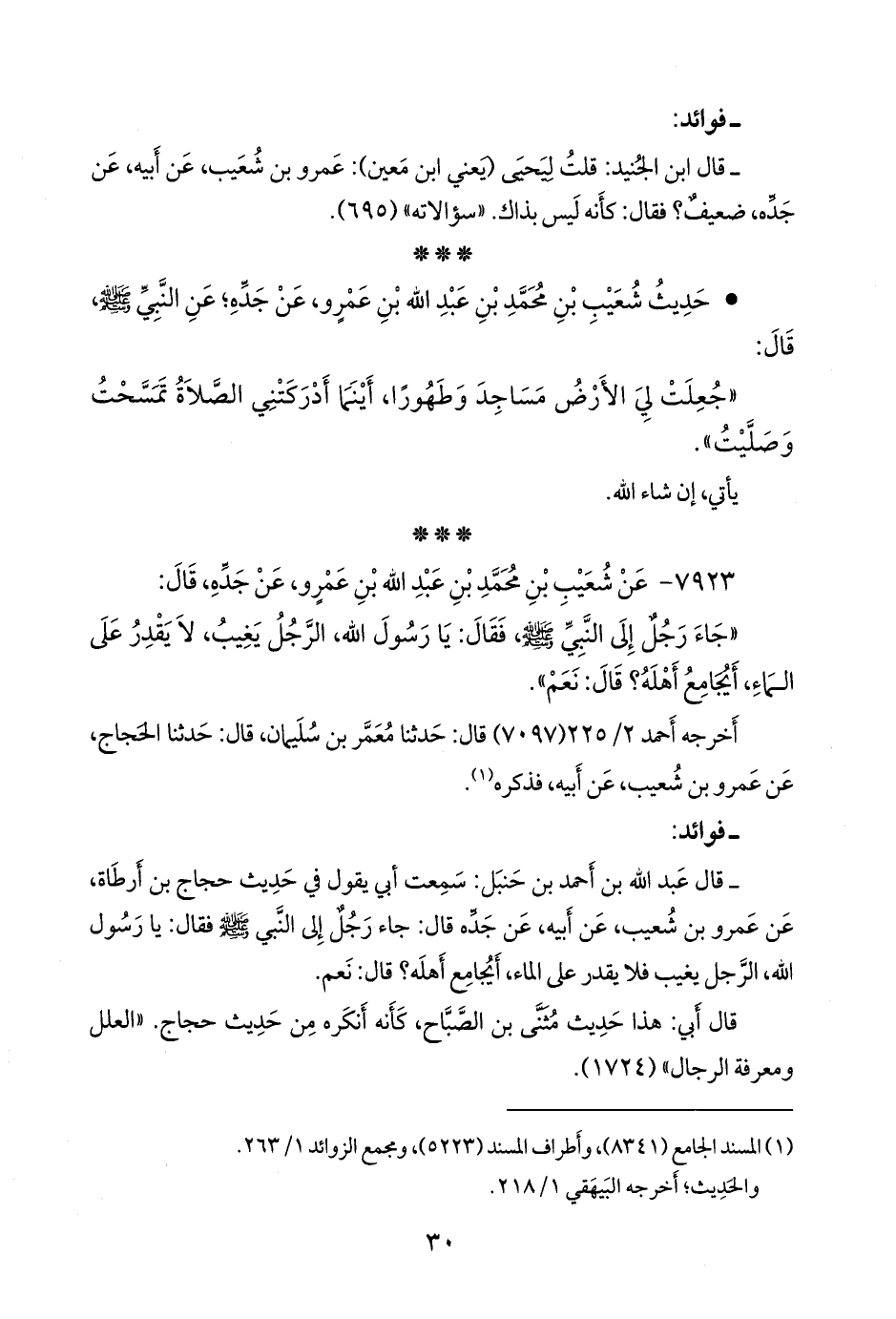 - قال عبد الله بن أَحمد بن حَنبل: سمعت أبي يقول في حديث حجاج بن أَرطاة، عن عَمرو بن شعيب، عن أَبيه، عن جَدِّه قال: جاء رجل إِلى النبي صَلى الله عَليه وسَلم فقال: يا رسول الله، الرجل يغيب فلا يقدر على الماء، أَيجامِع أَهله؟ قال: نعم.