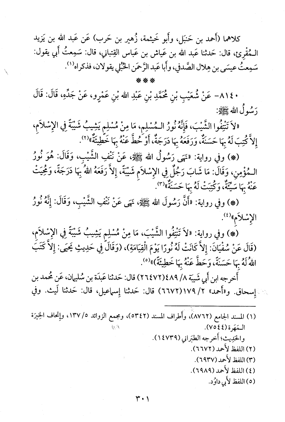 - وفي رواية: «لا تنتفوا الشيب، ما من مسلم يشيب شيبة في الإسلام، (قال عن سفيان: إلا كانت له نورا يوم القيامة)، (وقال في حديث يحيى: إلا كتب الله له بها حسنة، وحط عنه بها خطيئة)» (¬٤).