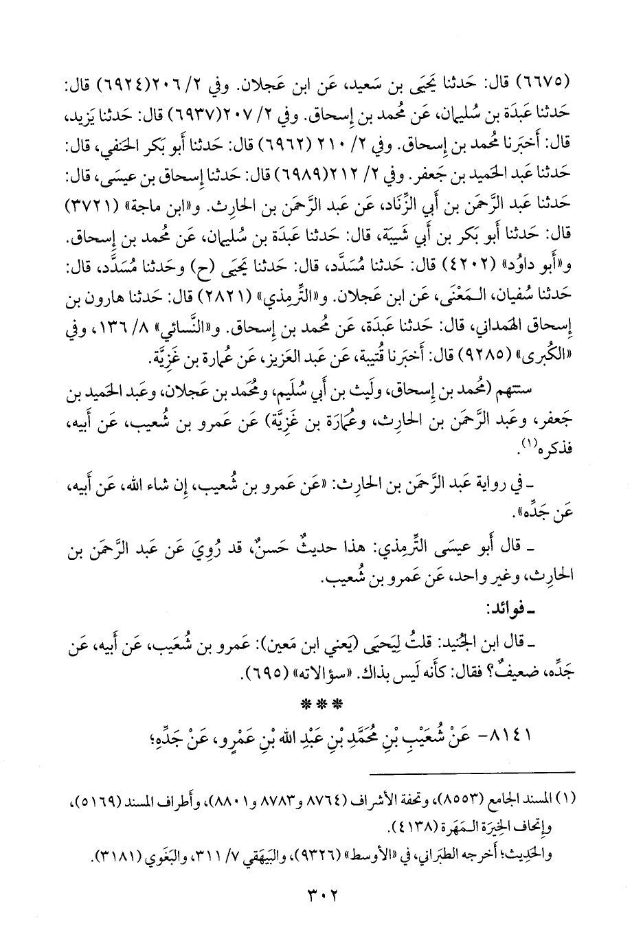 - قلنا: إِسناده ضعيفٌ؛ عَمرو بن شُعَيب بن محمد بن عبد الله بن عَمرو بن العاص ليس بحجة. انظر فوائد الحديث رقم (٧٩١٠).