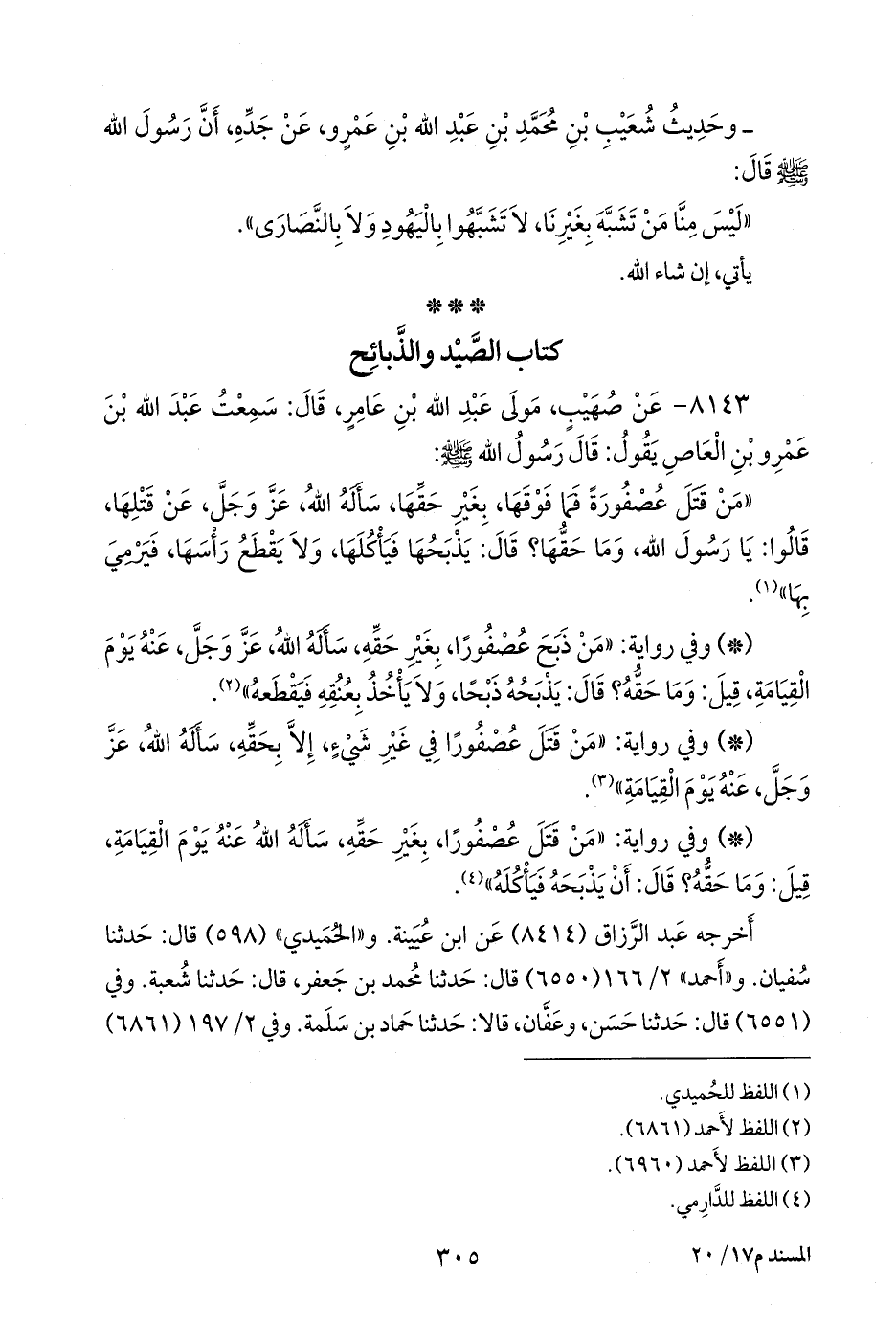 - وفي رواية: «من ذبح عصفورا، بغير حقه، سأله الله، عز وجل، عنه يوم القيامة، قيل: وما حقه؟ قال: يذبحه ذبحا، ولا يأخذ بعنقه فيقطعه» (¬٢).