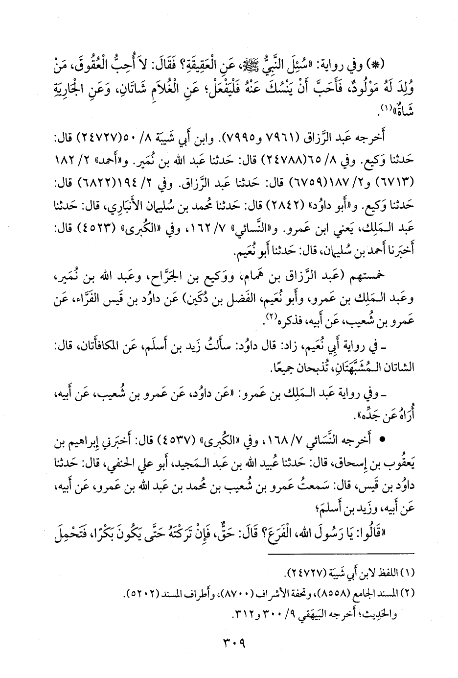خمستهم (عبد الرزاق بن همام، ووكيع بن الجراح، وعبد الله بن نُمير، وعبد الملك بن عَمرو، وأَبو نُعيم الفضل بن دُكَين) عن داود بن قيس الفراء، عن عَمرو بن شعيب، عن أبيه، فذكره (¬٢).