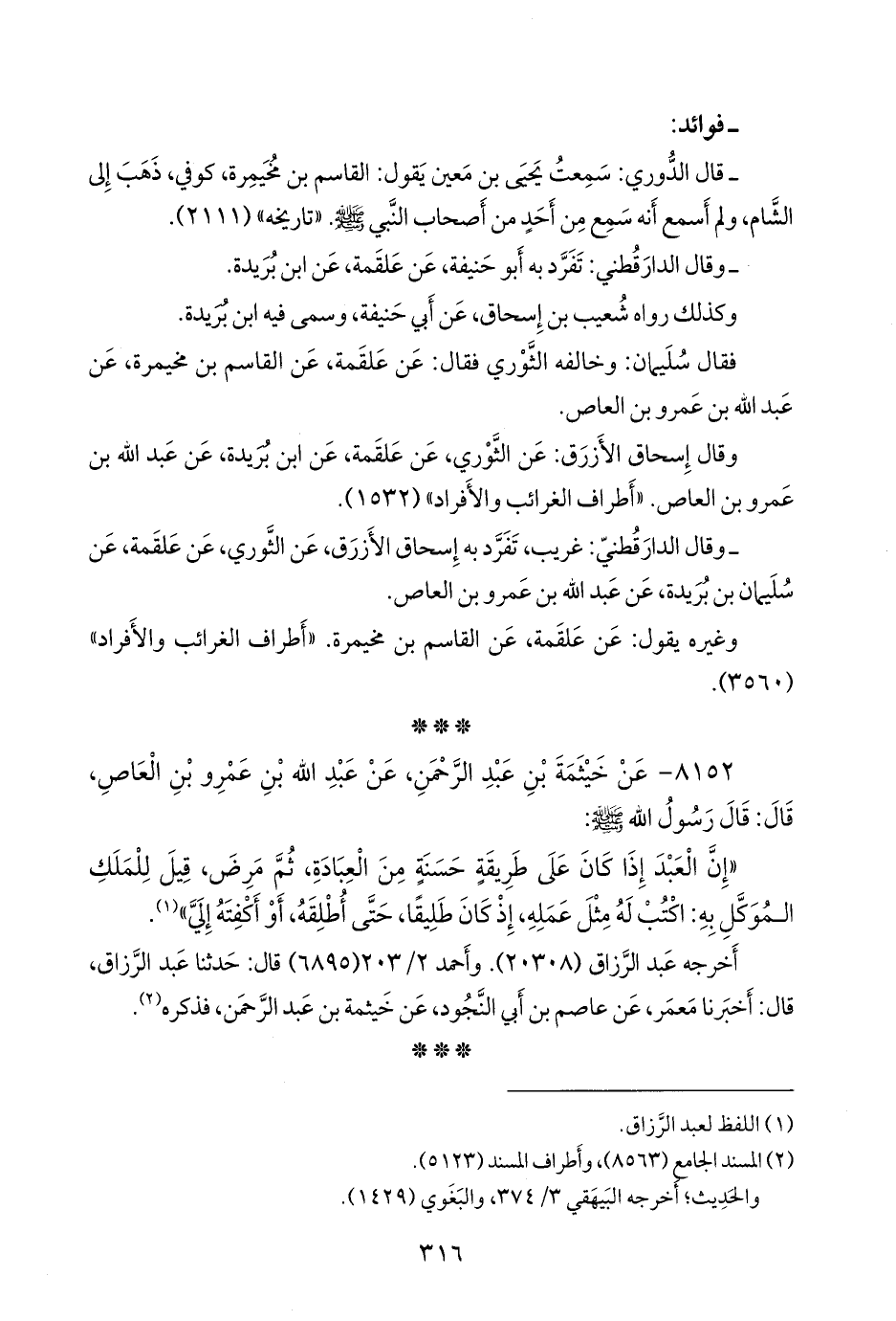 وقال إسحاق الأزرق: عن الثوري، عن علقمة، عن ابن بُريدة، عن عبد الله بن عَمرو بن العاص. «أطراف الغرائب والأفراد» (١٥٣٢).