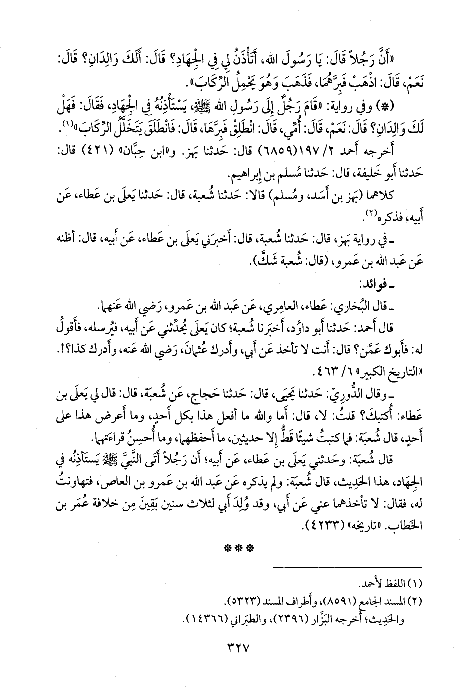 قال شعبة: وحدثني يَعلى بن عطاء، عن أبيه؛ أن رجلا أتى النبي صَلى الله عَليه وسَلم يستأذنه في الجهاد، هذا الحديث، قال شعبة: ولم يذكره عن عبد الله بن عَمرو بن العاص، فتهاونت له، فقال: لا تأخذهما عني عن أبي، وقد ولد أبي لثلاث سنين بقين من خلافة عمر بن الخطاب. «تاريخه» (٤٢٣٣).