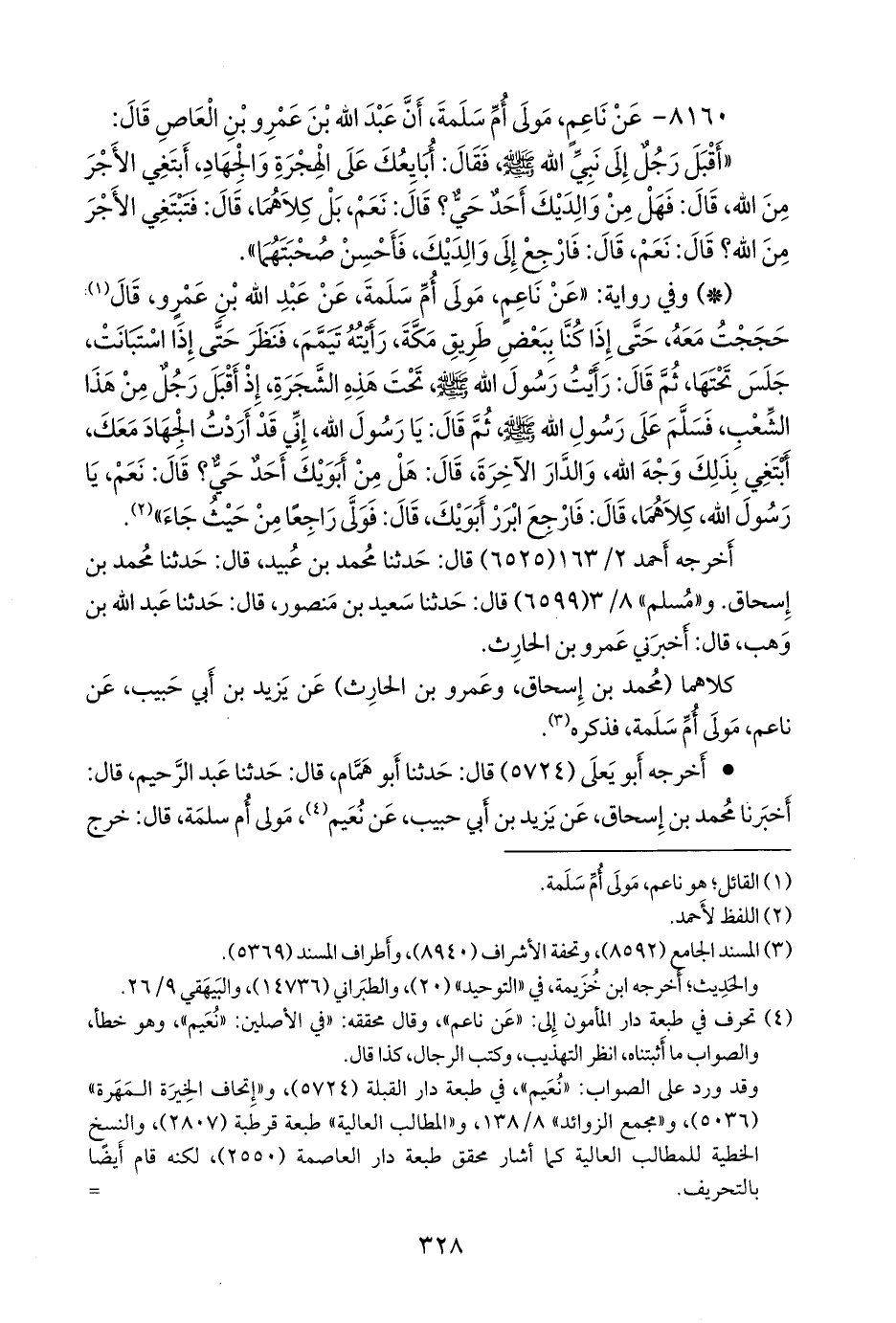 (¬١) في طبعتي دار المأمون والتأصيل لـ «مسند أبي يعلى»، وطبعتي «المقصد العلي»، و «المطالب العالية» طبعة العاصمة: «عن ناعم»، وأقر محققو هذه الطبعات أنه في النسخ الخطية لهذه الكتب: «عن نعيم»، فقاموا بإفساد ذلك بدعوى الإصلاح، نعم هو في كتب التراجم، ومصادر تخريج الحديث: «ناعم»، ولكننا هنا لا نحقق كتب التراجم والمصادر، بل ندقق هذه الرواية فقط، والتي خالفَت جميع مصادر التخريج، ففيها أيضًا: «عبد الله بن عُمر»، وفي جميع مصادر تخريج الحديث: «عبد الله بن عَمرو»، والحمد لله أنهم لم يحرفوها أيضًا، والتحقيق هو إثبات ما ورد في الرواية والأصول وإن كان خطأً.