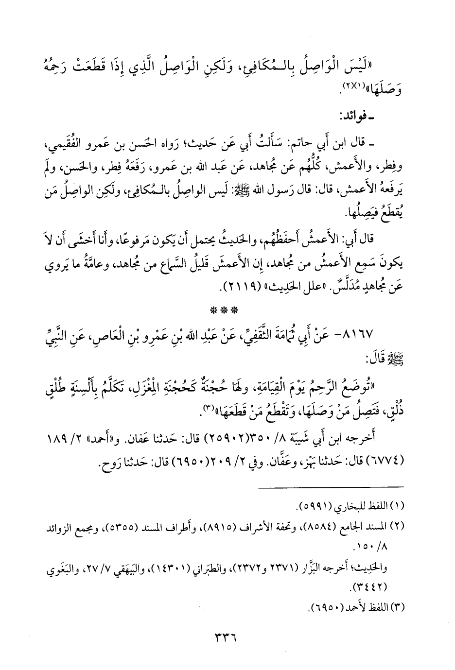 - قال ابن أَبي حاتم: سأَلتُ أَبي عن حديثٍ؛ رواه الحسن بن عَمرو الفُقَيمي، وفِطر، والأَعمش، كلهم عن مجاهد، عن عبد الله بن عَمرو، رفعه فِطر، والحسن، ولم يرفعه الأَعمش، قال: قال رسول الله صَلى الله عَليه وسَلم: ليس الواصِل بالمُكافِئ، ولكنِ الواصِل من يُقطَع فَيصِلها.