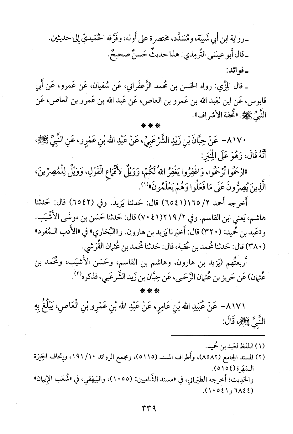 (¬٢) المسند الجامع (٨٥٨٢)، وأطراف المسند (٥١١٥)، ومَجمَع الزوائد ١٠/ ١٩١، وإتحاف الخِيرَة المَهَرة (٥١٥٤).