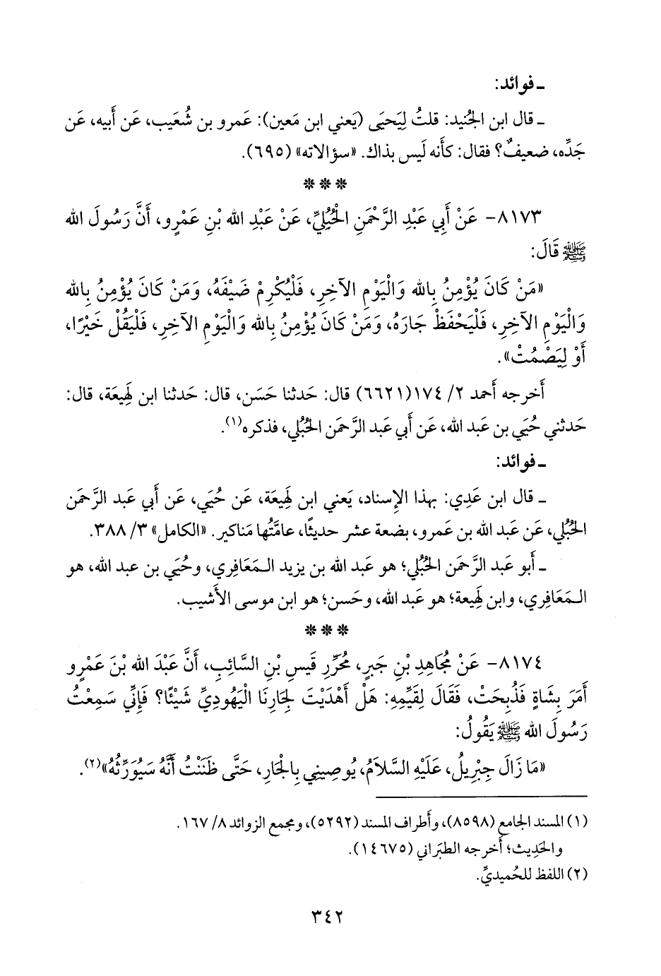 ٨١٧٣ - عن أبي عبد الرَّحمَن الحبلي، عن عبد الله بن عَمرو، أن رسول الله صَلى الله عَليه وسَلم قال: