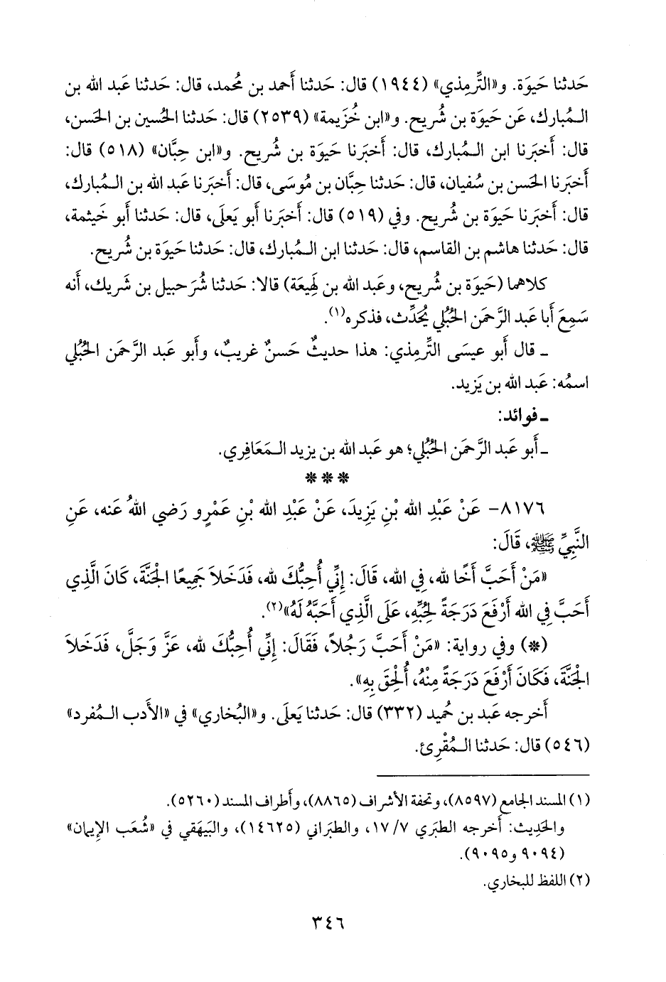 و «ابن خزيمة» (٢٥٣٩) قال: حدثنا الحسين بن الحسن، قال: أخبرنا ابن المبارك، قال: أخبرنا حَيْوَة بن شُرَيح. و «ابن حِبَّان» (٥١٨) قال: أخبرنا الحسن بن سفيان، قال: حدثنا حِبَّان بن موسى، قال: أخبرنا عبد الله بن المبارك، قال: أخبرنا حَيْوَة بن شُرَيح. وفي (٥١٩) قال: أخبرنا أَبو يَعلى، قال: حدثنا أَبو خيثمة، قال: حدثنا هاشم بن القاسم، قال: حدثنا ابن المبارك، قال: حدثنا حَيْوَة بن شُرَيح.