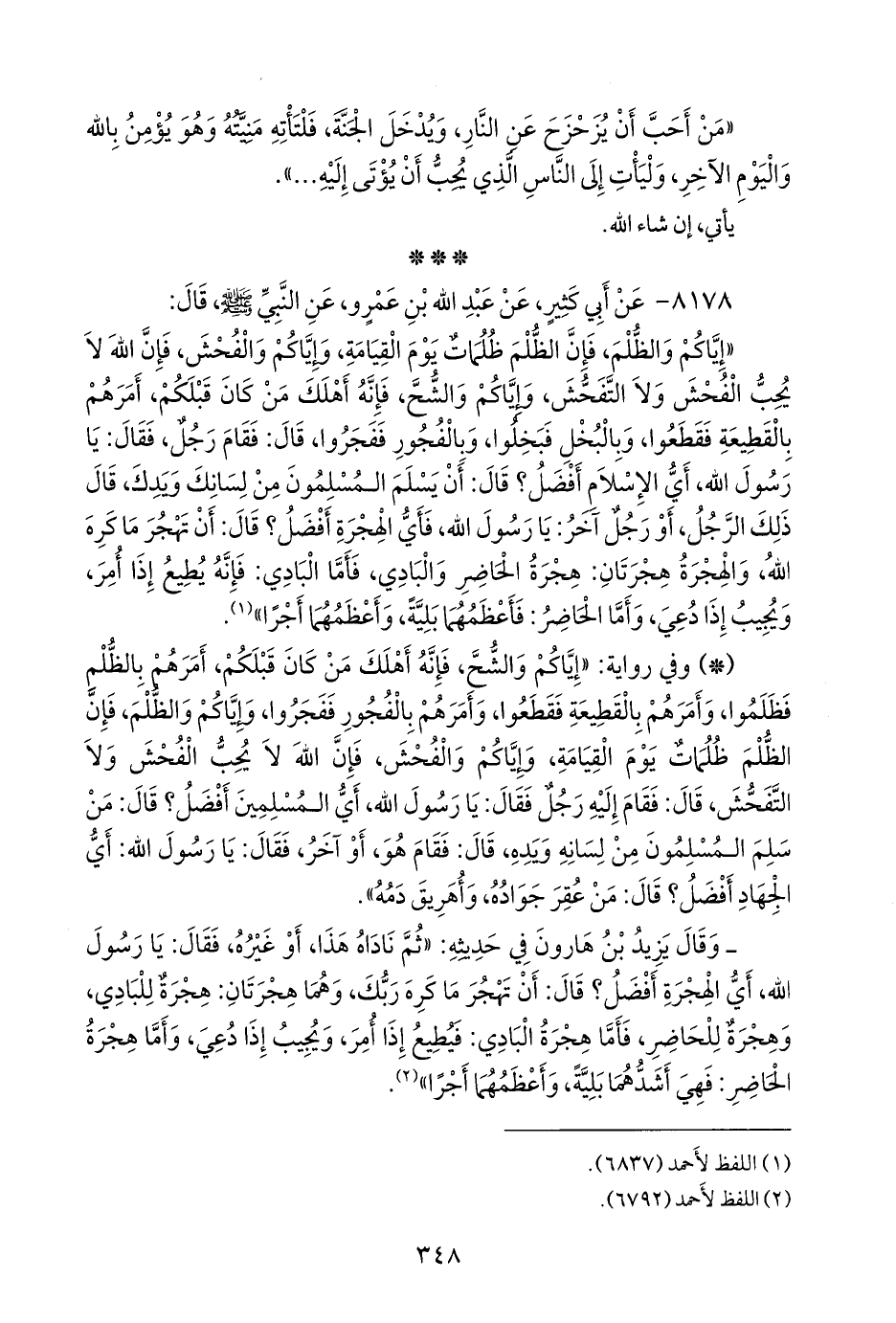 «إياكم والظلم، فإن الظلم ظلمات يوم القيامة، وإياكم والفحش، فإن الله لا يحب الفحش ولا التفحش، وإياكم والشح، فإنه أهلك من كان قبلكم، أمرهم بالقطيعة فقطعوا، وبالبخل فبخلوا، وبالفجور ففجروا، قال: فقام رجل، فقال: يا رسول الله، أي الإسلام أفضل؟ قال: أن يسلم المسلمون من لسانك ويدك، قال ذلك الرجل، أو رجل آخر: يا رسول الله، فأي الهجرة أفضل؟ قال: أن تهجر ما كره الله، والهجرة هجرتان: هجرة الحاضر والبادي، فأما البادي: فإنه يطيع إذا أمر، ويجيب إذا دعي، وأما الحاضر: فأعظمهما بلية، وأعظمهما أجرا» (¬١).