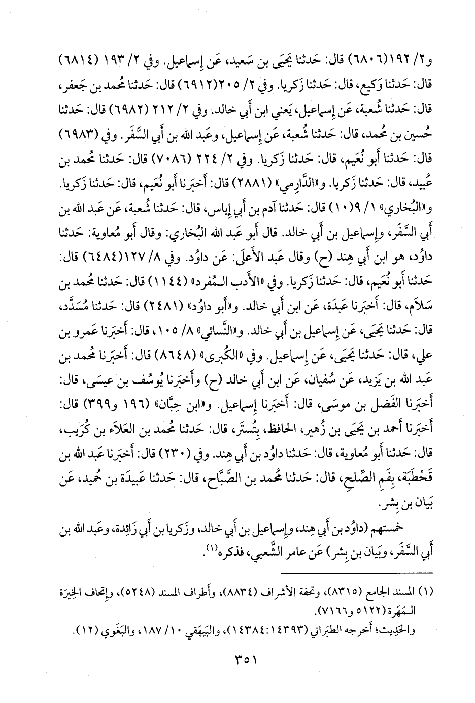 وفي ٢/ ٢٠٥ (٦٩١٢) قال: حدثنا محمد بن جعفر، قال: حدثنا شعبة، عن إسماعيل، يعني ابن أبي خالد. وفي ٢/ ٢١٢ (٦٩٨٢) قال: حدثنا حسين بن محمد، قال: حدثنا شعبة، عن إسماعيل، وعبد الله بن أبي السفر. وفي (٦٩٨٣) قال: حدثنا أَبو نُعيم، قال: حدثنا زكريا. وفي ٢/ ٢٢٤ (٧٠٨٦) قال: حدثنا محمد بن عبيد، قال: حدثنا زكريا. و «الدَّارِمي» (٢٨٨١) قال: أخبرنا أَبو نُعيم، قال: حدثنا زكريا. و «البخاري» ١/ ١١ (١٠) قال: حدثنا آدم بن أبي إياس، قال: حدثنا شعبة، عن عبد الله بن أبي السفر، وإسماعيل. وفي ٨/ ١٠٢ (٦٤٨٤) قال: حدثنا أَبو نُعيم، قال: حدثنا زكريا. وفي «الأدب المفرد» (١١٤٤) قال: حدثنا محمد بن سَلَام، قال: أخبرنا عبدة، عن ابن أبي خالد. و «أَبو داود» (٢٤٨١) قال: حدثنا مُسدد، قال: حدثنا يحيى، عن إسماعيل بن أبي خالد. و «النَّسَائي» ٨/ ١٠٥، قال: أخبرنا عَمرو بن علي، قال: حدثنا يحيى، عن إسماعيل. وفي «الكبرى» (٨٦٤٨) قال: أخبرنا محمد بن عبد الله بن يزيد، عن سفيان، عن ابن أبي خالد (ح) وأخبرنا يوسف بن عيسى، قال: أخبرنا الفضل بن موسى، قال: أخبرنا إسماعيل. و «ابن حِبَّان» (١٩٦ و ٣٩٩) قال: أخبرنا أحمد بن يحيى بن زهير، الحافظ، بتستر، قال: حدثنا محمد بن العلاء بن كُريب، قال: حدثنا أَبو معاوية، قال: حدثنا داود بن أبي هند. وفي (٢٣٠) قال: أخبرنا عبد الله بن قَحطَبة، بِفَم الصِّلْح، قال: حدثنا محمد بن الصباح، قال: حدثنا عَبيدة بن حُميد، عن بيان بن بشر.