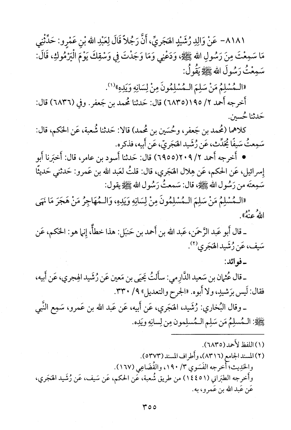 - وقال البخاري: رشيد، الهجري، عن أبيه، عن عبد الله بن عَمرو، سمع النبي صَلى الله عَليه وسَلم: المسلم من سلم المسلمون من لسانه ويده.