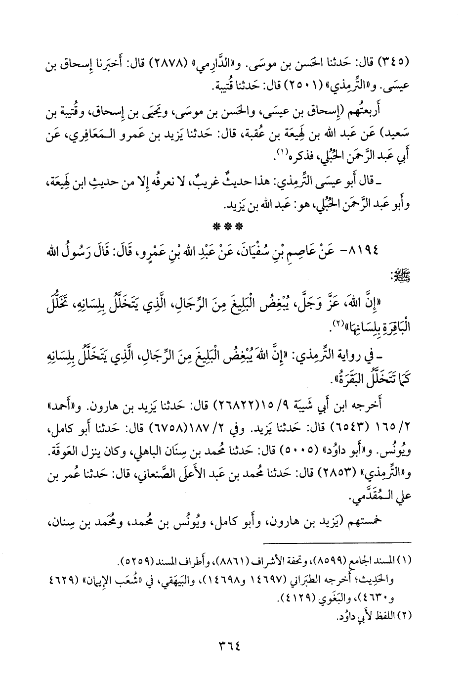 - في رواية التِّرمِذي: «إن الله يبغض البليغ من الرجال، الذي يتخلل بلسانه كما تتخلل البقرة».