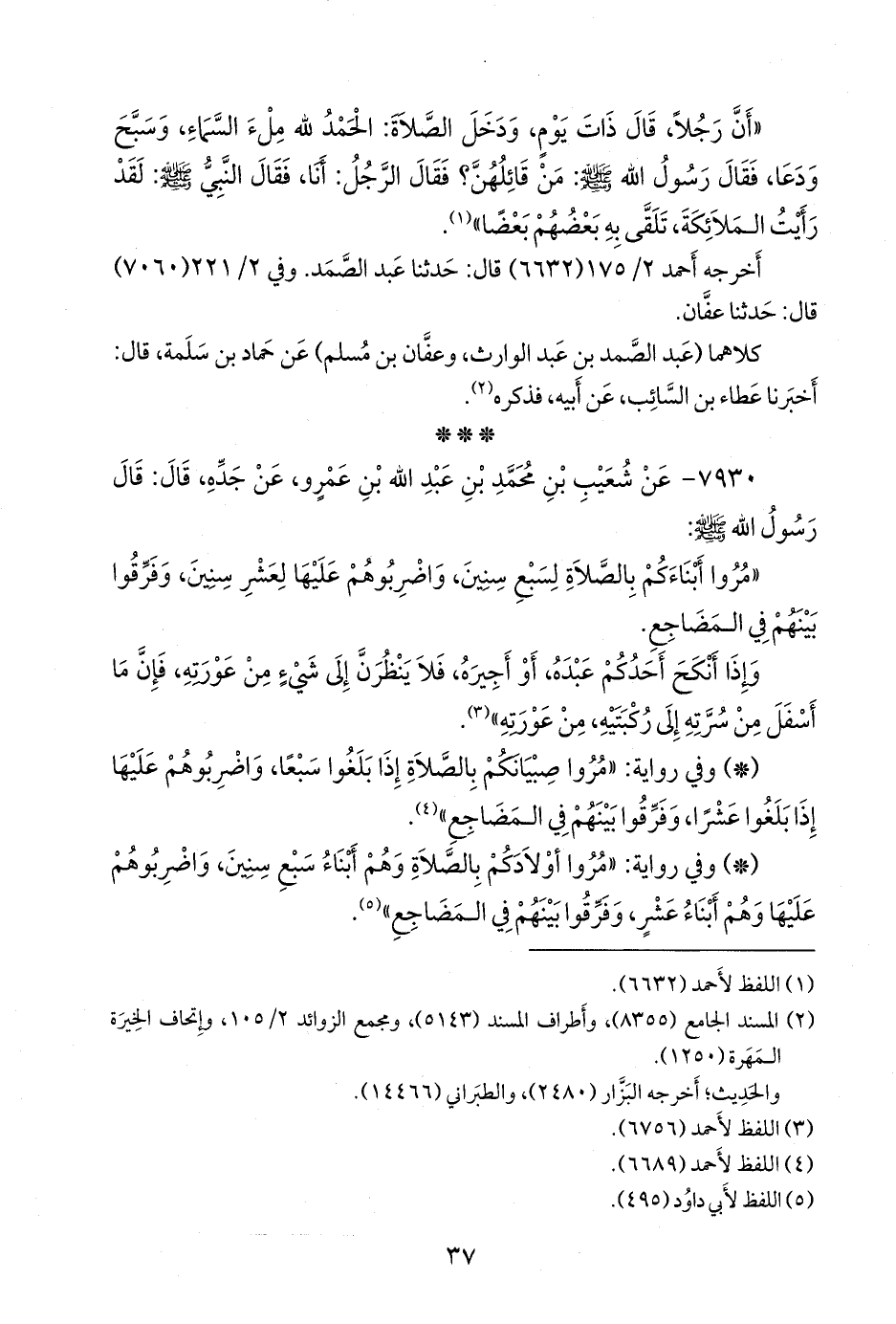- وفي رواية: «مروا أولادكم بالصلاة وهم أبناء سبع سنين، واضربوهم عليها وهم أبناء عشر، وفرقوا بينهم في المضاجع» (¬٣).
