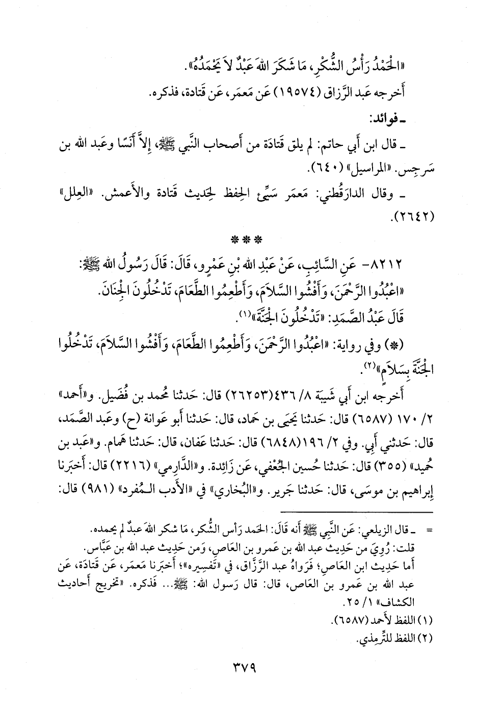 ٨٢١٢ - عن السائب، عن عبد الله بن عَمرو، قال: قال رسول الله صَلى الله عَليه وسَلم: