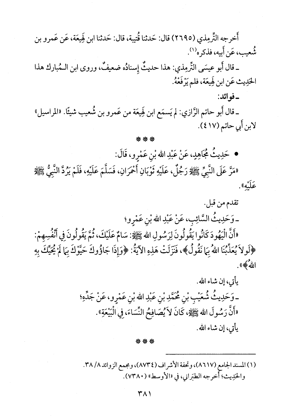 - وقال أَبو حاتم الرازي: لم يسمع ابن لَهِيعة من عَمرو بن شعيب شيئا. «المراسيل» لابن أبي حاتم (٤١٧).
