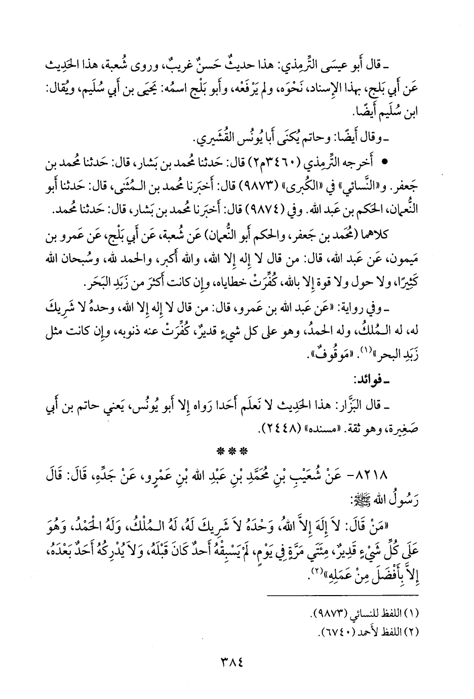 كلاهما (محمد بن عيسى التِّرمِذي، وأحمد بن شعيب النَّسائي) عن محمد بن بشار، عن محمد بن جعفر، عن شعبة بن الحجاج، عن أَبي بَلْج، عن عَمرو بن ميمون، عن عبد الله، قال: من قال: لا إله إلا الله، والله أكبر، والحمد لله، وسبحان الله كثيرًا، ولا حول ولا قوة إلا بالله، كُفِّرَتْ خطاياه، وإن كانت أَكثر من زَبَد البحر (¬١). «موقوف».