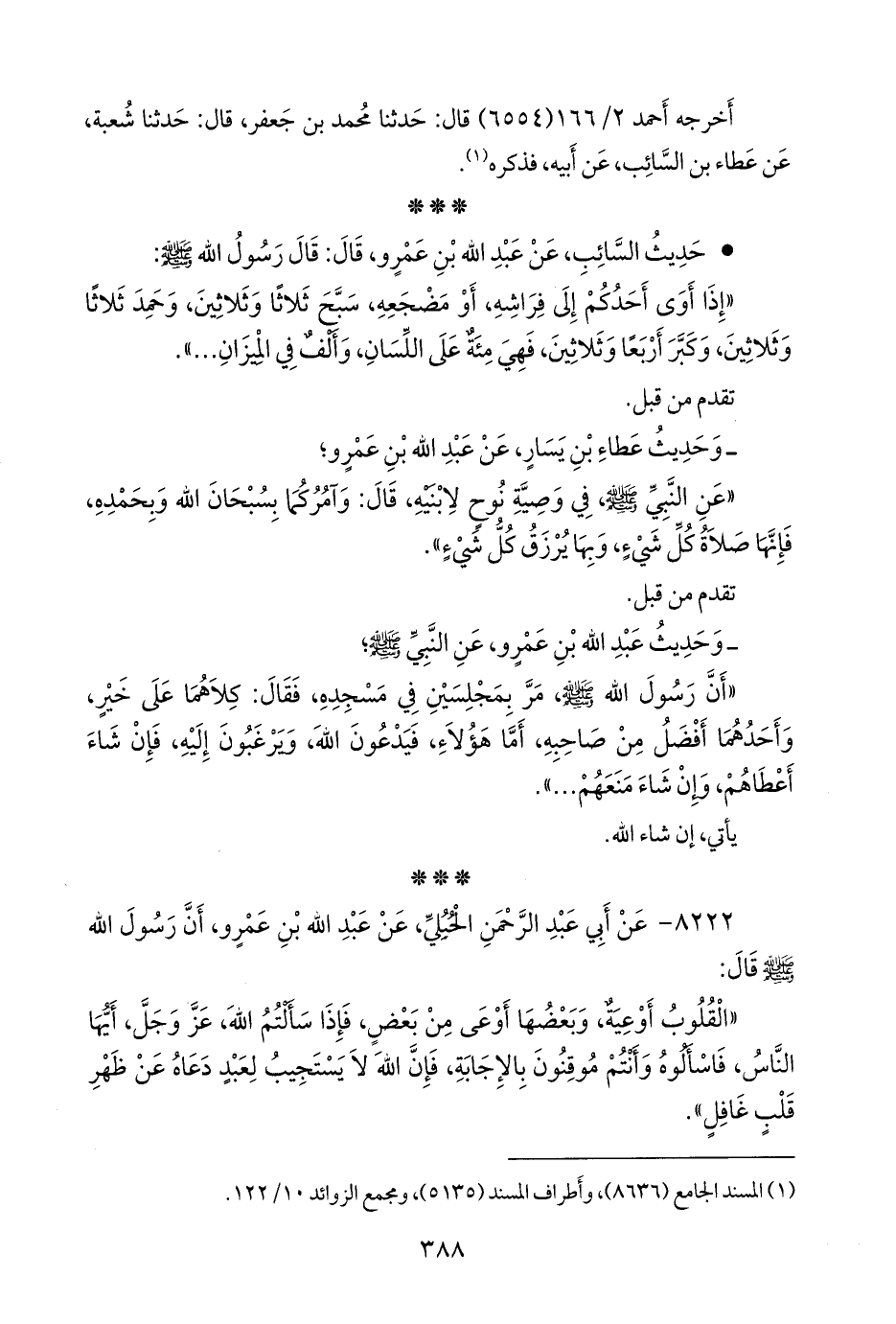 • حديث السائب، عن عبد الله بن عمرو، قال: قال رسول الله صَلى الله عَليه وسَلم: