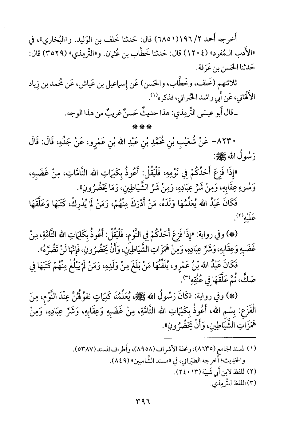 - وفي رواية: «كان رسول الله صَلى الله عَليه وسَلم يعلمنا كلمات نقولهن عند النوم، من الفزع: بسم الله، أعوذ بكلمات الله التامة، من غضبه وعقابه، وشر عباده، ومن همزات الشياطين، وأن يحضرون».