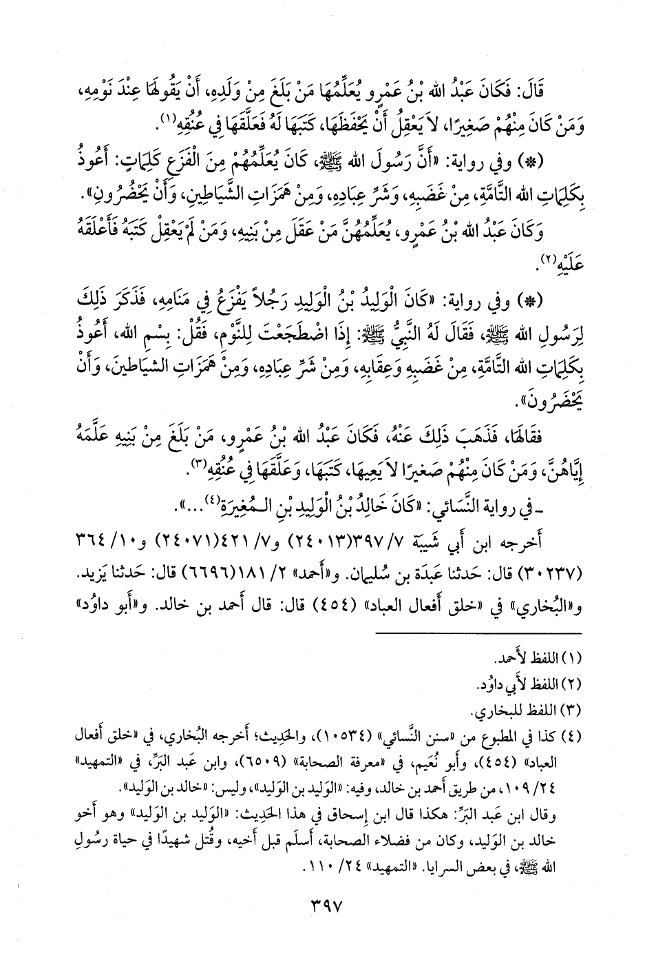 - وفي رواية: «كان الوليد بن الوليد رجلا يفزع في منامه، فذكر ذلك لرسول الله صَلى الله عَليه وسَلم فقال له النبي صَلى الله عَليه وسَلم: إذا اضطجعت للنوم، فقل: بسم الله، أعوذ بكلمات الله التامة، من غضبه وعقابه، ومن شر عباده، ومن همزات الشياطين، وأن يحضرون».