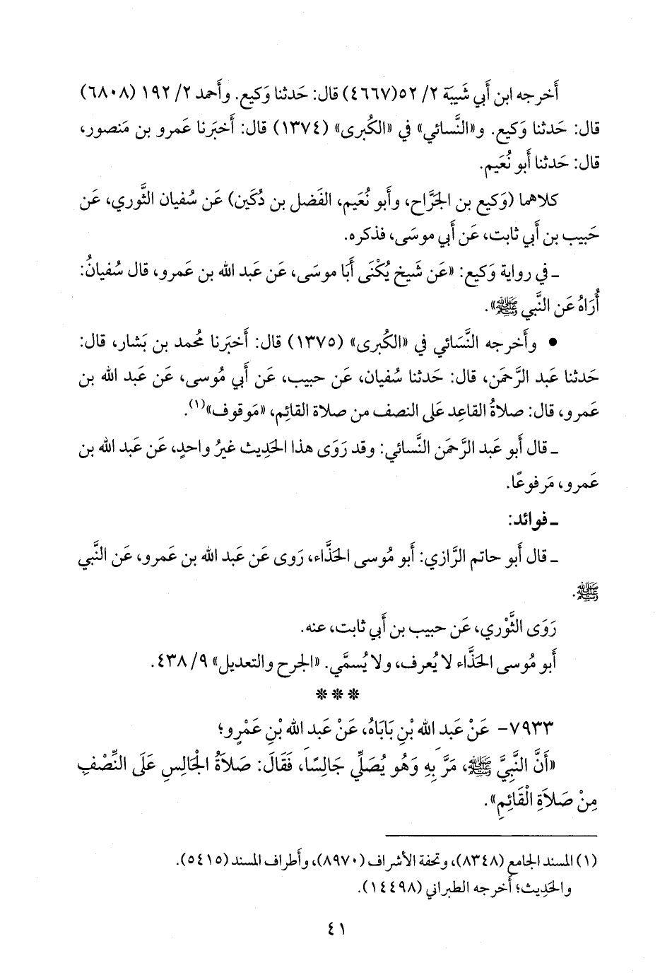 - قلنا: إِسناده ضعيفٌ؛ قال أَبو حاتم الرازي: أَبو موسى الحذاء، روى عن عبد الله بن عَمرو، عن النبي صَلى الله عَليه وسَلم.