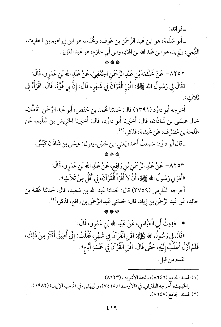 «أمرني رسول الله صَلى الله عَليه وسَلم أن لا أقرأ القرآن، في أقلَّ من ثلاث».